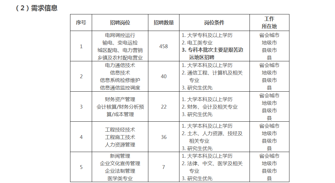 注意:1.招聘崗位只列舉了部分大類,凡應(yīng)聘者均需要服從安排;2.電工類專業(yè)每個(gè)單位都有需求,??票九沃饕瞧D苦邊遠(yuǎn)地區(qū)招聘,具體請(qǐng)應(yīng)聘者咨詢各用人單位;3.歡迎大家踴躍報(bào)名應(yīng)聘,審慎選擇調(diào)劑,我們將根據(jù)報(bào)名應(yīng)聘人數(shù)、生源總體素質(zhì)、考試考核成績(jī)等適度調(diào)劑調(diào)整或新增各批次之間以及相關(guān)單位之間的招聘數(shù)量和專業(yè);4.非電工類崗位和專業(yè)主要參考“附件1”,在具體招聘過程中,我們將根據(jù)實(shí)際情況進(jìn)行調(diào)劑調(diào)整;5.本表存在疑問或歧義的地方統(tǒng)一以國(guó)網(wǎng)四川省電力公司解釋為準(zhǔn)。