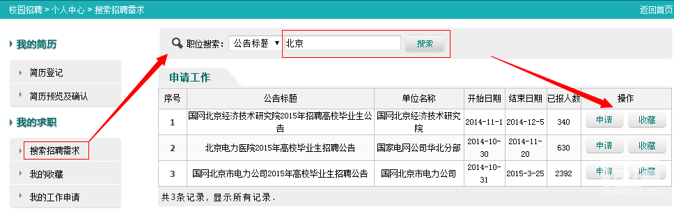 五、申請工作在“我的求職”中搜索招聘需求,可以輸入關鍵詞進行搜索,找到要申請的公司后點擊后面的申請工作后選擇職位即可。如果未定申請公司可先把心儀的進行收藏,之后再“我的收藏”里查看公告詳情,考慮之后再申請。