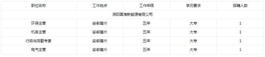 一、招聘崗位及人數(shù) 序號(hào) 單位 部門(mén)及崗位 招聘人數(shù) 1 渦陽(yáng)國(guó)淮新能源公司 行政與后勤專(zhuān)責(zé) 1 2 渦陽(yáng)國(guó)淮新能源公司 電氣主管 1 3 渦陽(yáng)國(guó)淮新能源公司 環(huán)保主管 1 4 渦陽(yáng)國(guó)淮新能源公司 機(jī)務(wù)主管 1 備注:國(guó)家電投系統(tǒng)內(nèi)員工優(yōu)先錄用。