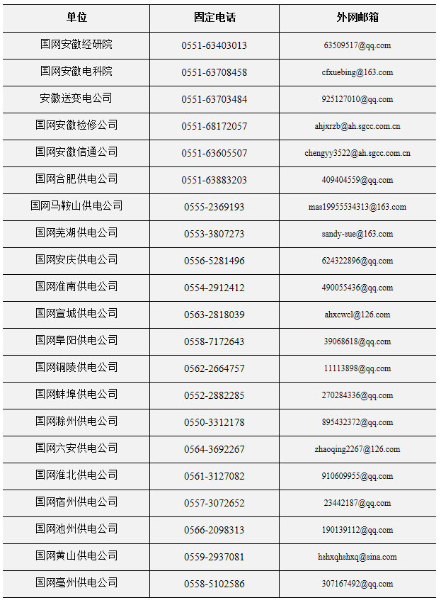 國網(wǎng)安徽省電力有限公司2020年度招聘期間各單位聯(lián)系方式
