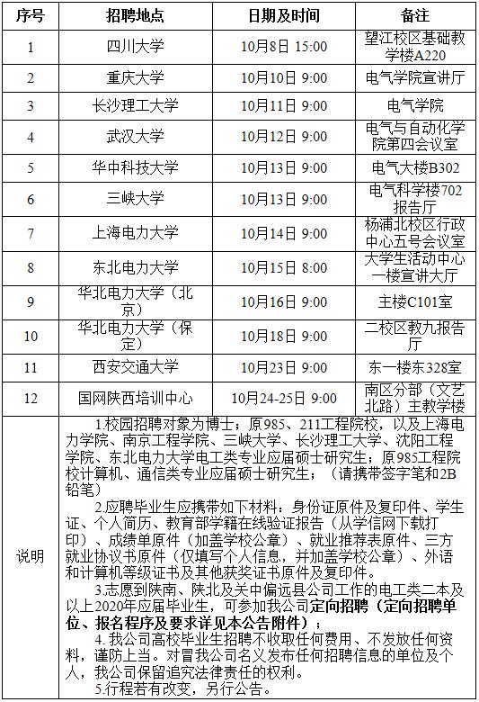 根據(jù)國(guó)網(wǎng)陜西省電力公司2020年高校畢業(yè)生招聘工作安排,現(xiàn)將校園招聘行程安排公告如下: